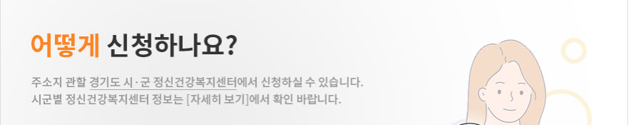 - 지원 신청 시 주민등록상 주소지를 기준으로 하며, 각 정신건강복지센터에 사전 문의를 권장드립니다.